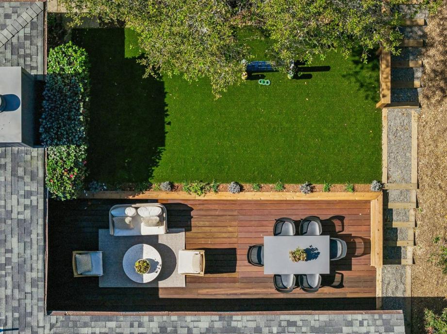 - Tiered backyard with patio and flat play area